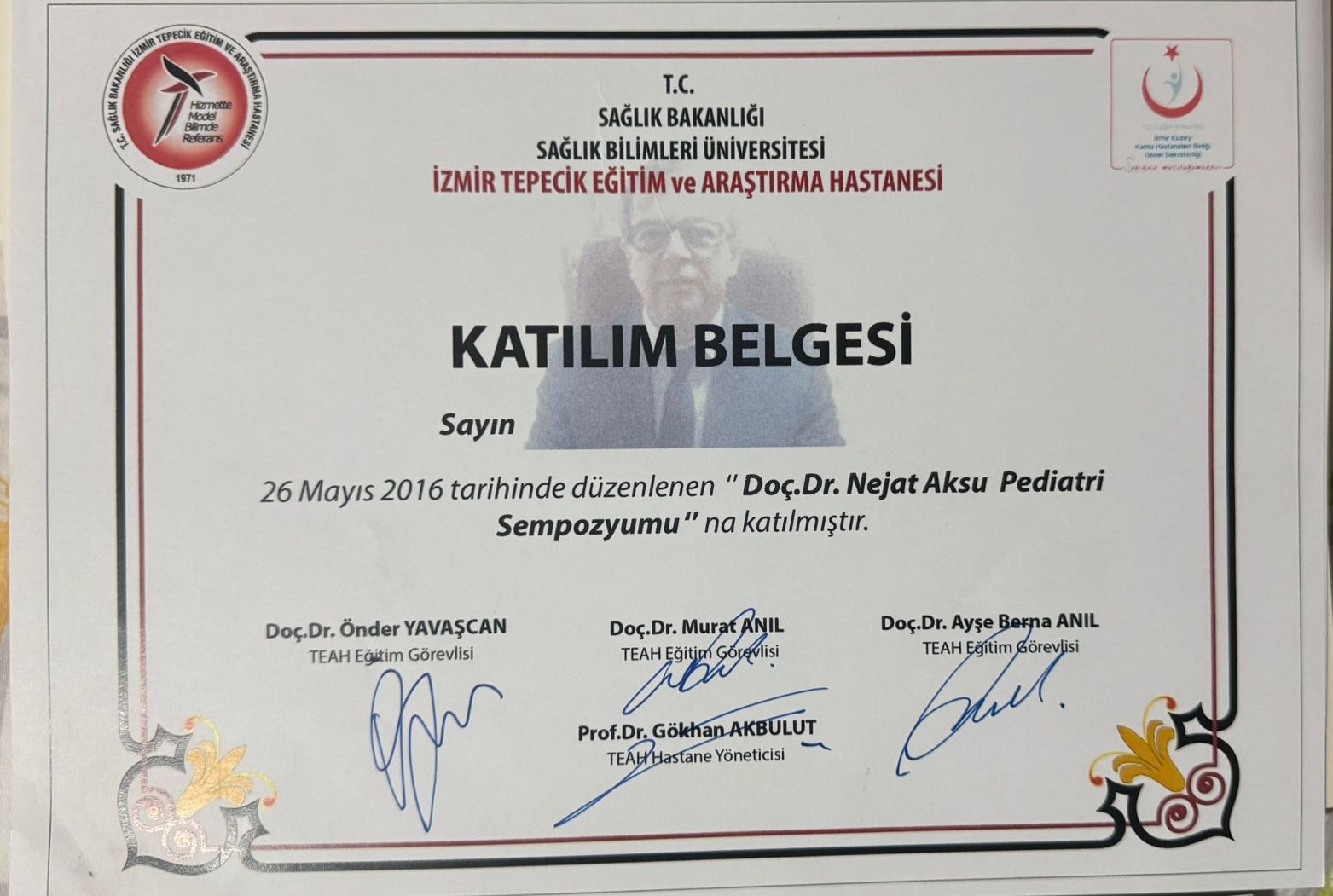 Doç. Dr. Nejat Aksu Pediatri Sempozyumu Katılım Belgesi